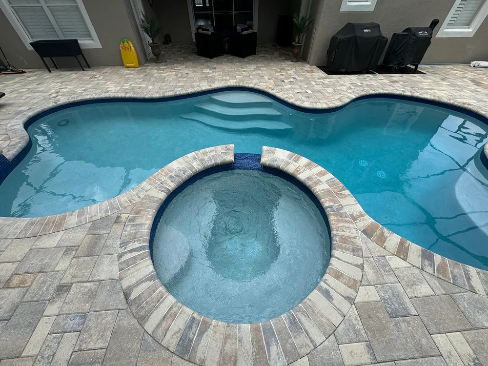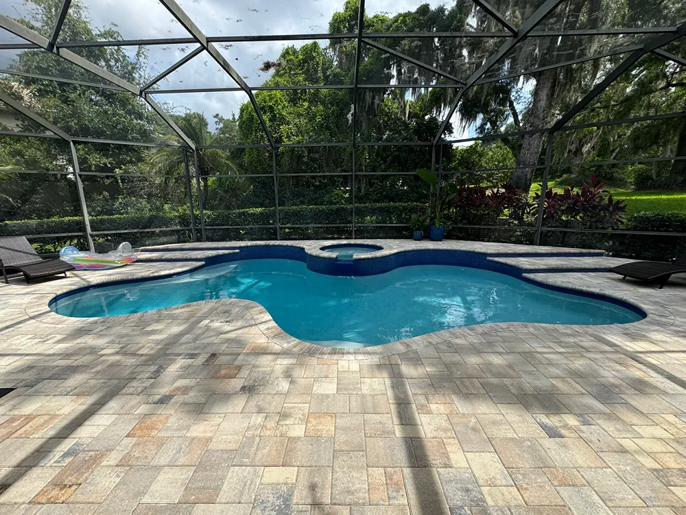 This Melbourne landscaping project features a custom front-yard design with new outdoor lighting and a beautiful paver driveway that adds strong curb appeal. In the backyard, pavers were installed around the pool to create a family-friendly, inviting space perfect for relaxing and hanging out. The updated layout delivers a clean, modern look with long-lasting usability.