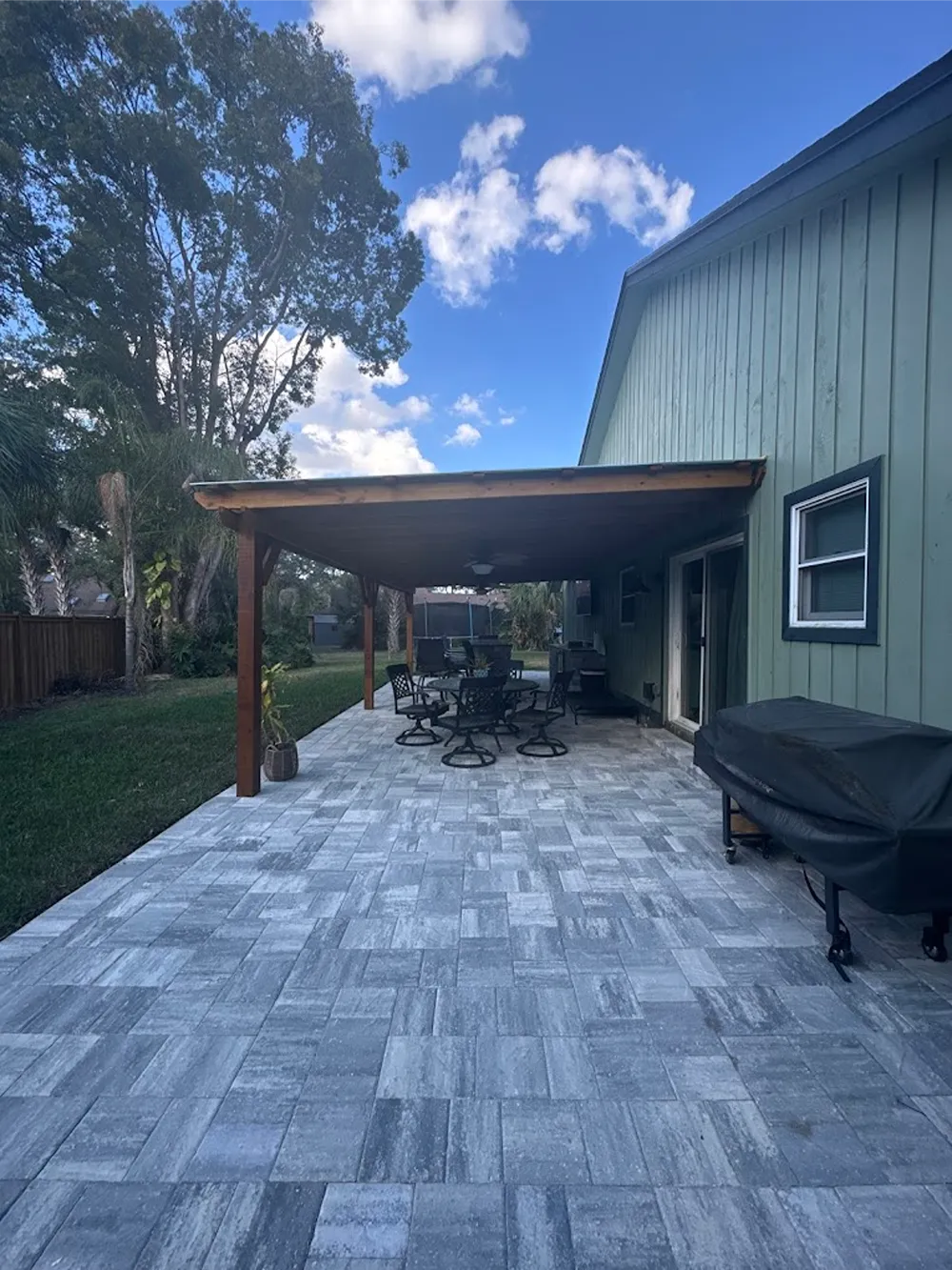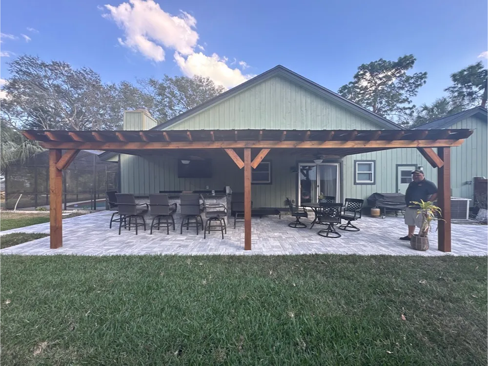 This Tampa landscaping project features a custom paver patio hardscape paired with a beautifully built custom pergola over the grill and seating area. The new layout creates a shaded, comfortable space perfect for relaxing and entertaining. With its clean design and durable materials, the upgraded backyard is now an ideal spot for evening gatherings with friends and family.