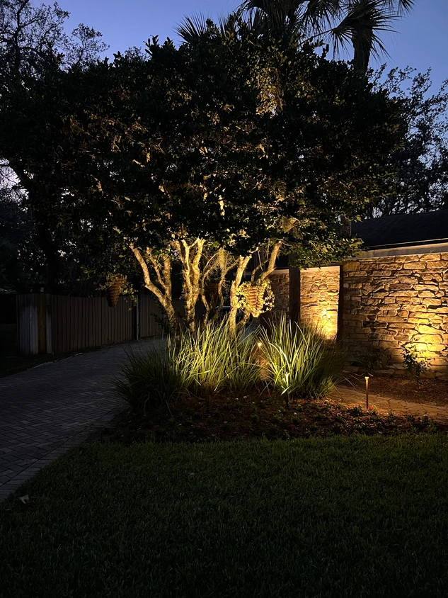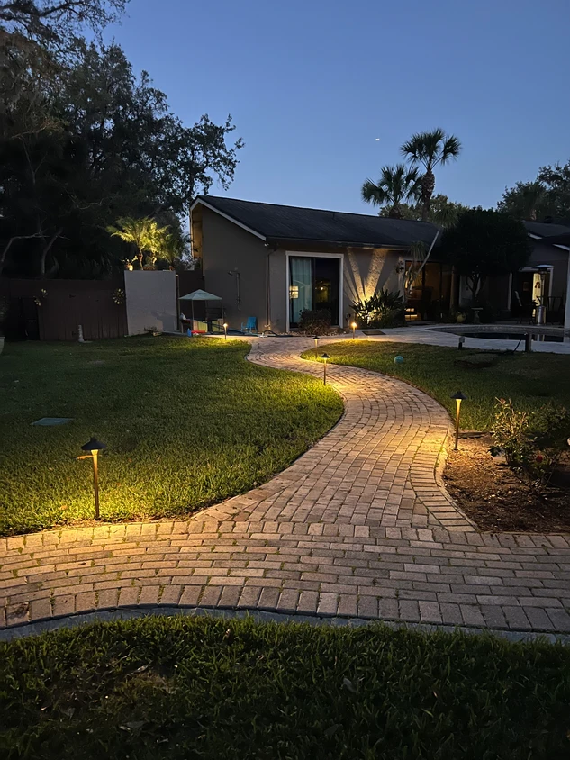 This landscape lighting project showcases a stunning lighting installation around a house and walkways. The project highlights the use of premium lighting fixtures to create a warm and inviting ambiance, while also providing functional lighting for safety and security.